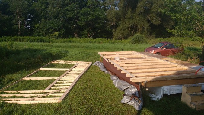 I built the walls by myself on the floor of the trailer so they were flat then dragged them off onto the ground